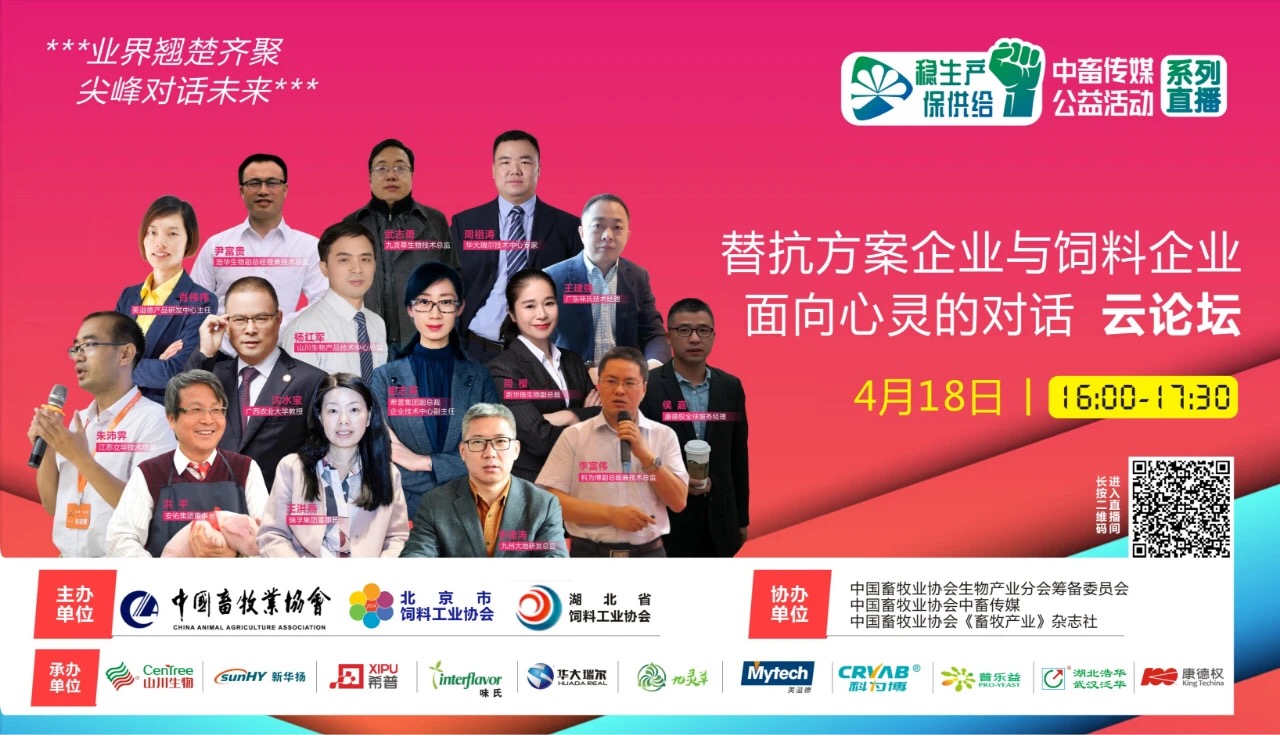 4月18日,中國畜牧業(yè)協(xié)會、北京市飼料工業(yè)協(xié)會、湖北省飼料工業(yè)協(xié)會邀請業(yè)內(nèi)專家和知名企業(yè)共同發(fā)起穩(wěn)生產(chǎn)、保供給公益活動——“禁抗遇上雙疫,飼料企業(yè)如何軟著陸”生物替抗與營養(yǎng)免疫系統(tǒng)解決方案云會議。行業(yè)大咖隔空對話,帶我們感知行業(yè)發(fā)展脈搏,洞察飼料新技術(shù)應(yīng)用的時(shí)代機(jī)遇,為行業(yè)發(fā)展指點(diǎn)迷津。會議直播累計(jì)超過22萬人在線觀看。